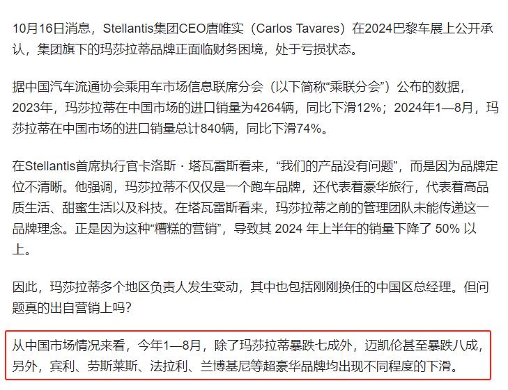 瑪莎拉蒂前八個月銷量下降七成。邁凱倫下降八成,賓利、勞斯勞斯、法拉利和蘭博基尼也有不同程度的下滑。