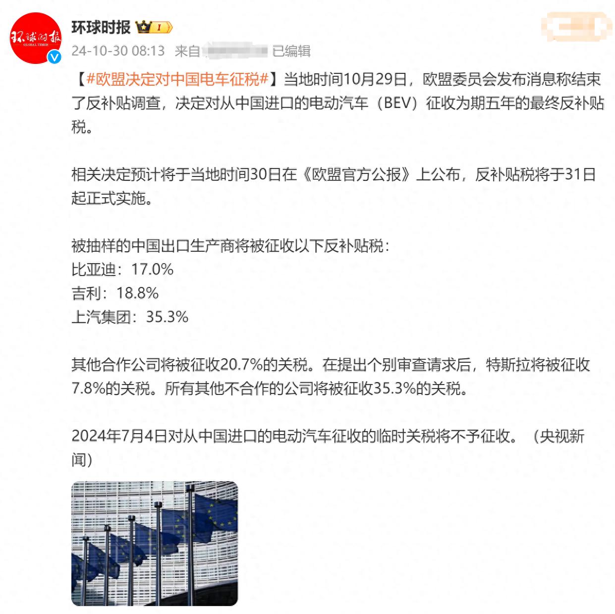 歐盟最終還是執意,對來自中國的電動車,徵收反補貼稅,爲期五年。