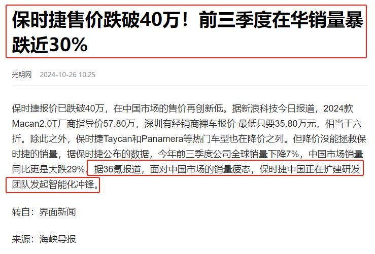 別以爲就一家大衆不行,以前在中國賣爆的豪車保時捷,前三季度全球銷量下降7%,中國市場銷量大跌29%,售價更是跌破了40萬。