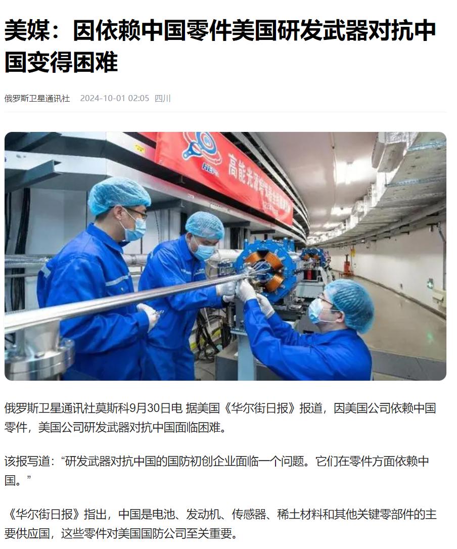舉個例子,老美的華爾街日報就曾報道,美國國防部高度依賴中國企業提供的關鍵零部件,尤其是電池、電池、發動機、傳感器、稀土材料等,更關鍵的是他們很難找到其他合適的供應商。他們甚至發現,如果離開中國產業鏈,連美國軍工創新都會出問題。