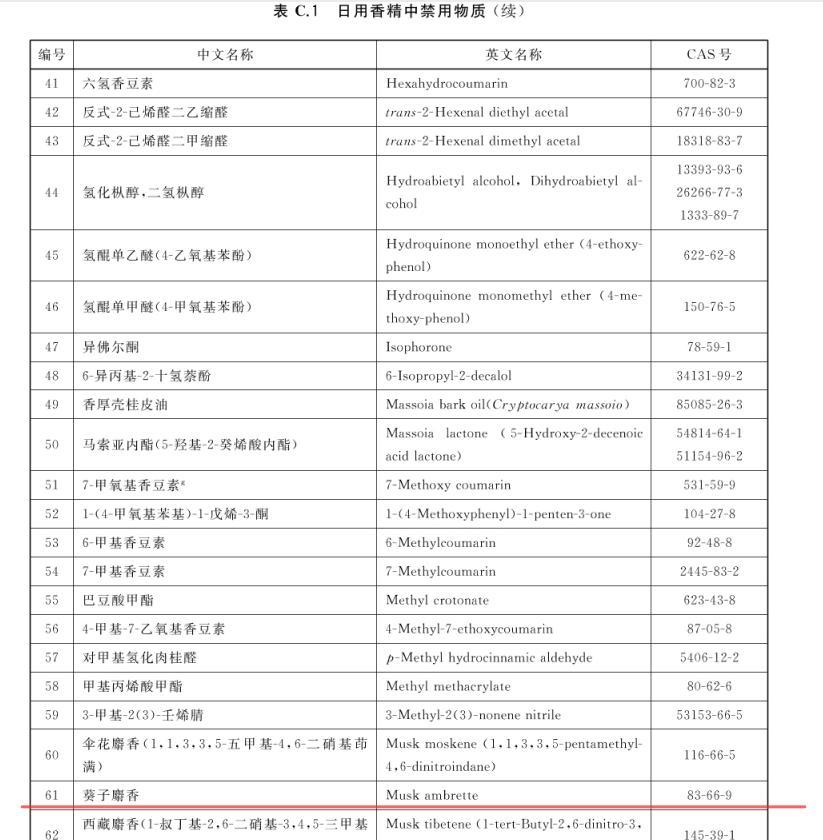據《中國化妝品科研成果藍皮書(2022年)》主編、首席研究員孟祥璟博士向筆者介紹:我國在《化妝品安全技術規範》(2015版)中,已將傘花麝香、葵子麝香以及西藏麝香列爲禁用物質,明確規定了在香水中可使用的麝香種類和限量;《GB/T 22731-2017日化香精》也已將二甲苯麝香列入禁用名單。