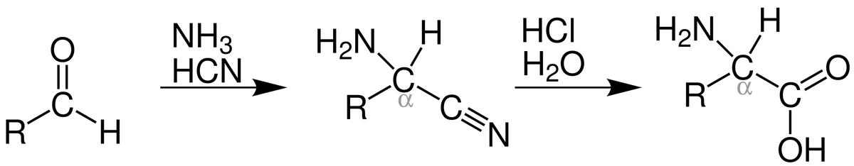 由簡單無機物形成氨基酸(最右側化學式)的化學反應方程式 (圖片來源:Wikipedia)