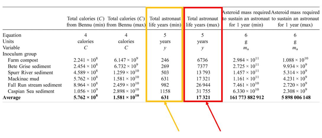 經過計算,他們發現,僅小行星貝努,在最低效率的情況下產生的生物質,足夠631位航天員一年的食物消耗,而在最高效率的情況下,足夠17000位航天員一年的食物消耗。