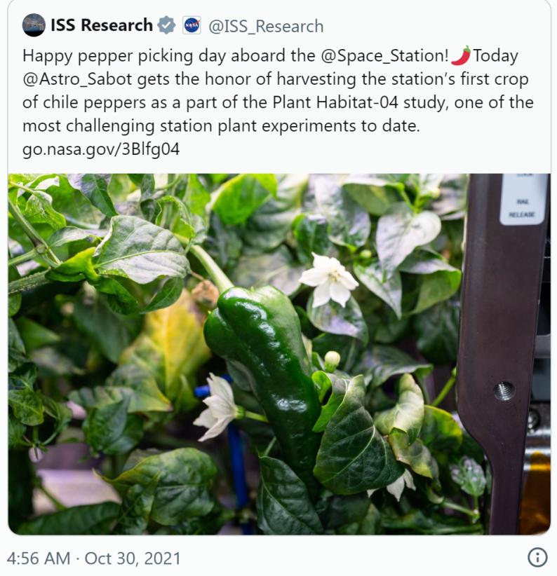 國際空間站中種植出來的辣椒 (圖片來源:ISS Research)