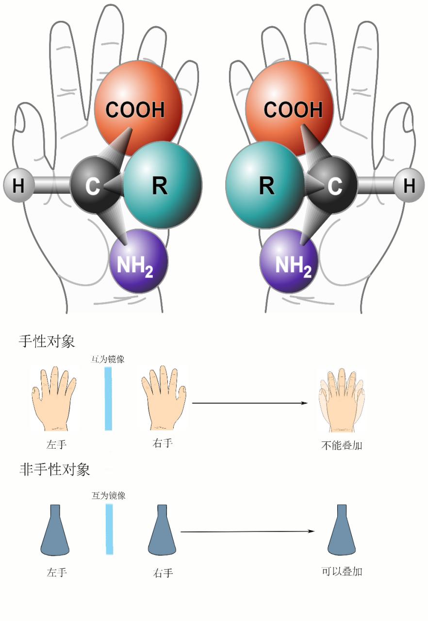氨基酸的手性示意圖,它們的結構鏡像對稱,但是無法通過平移重合到一起 圖片來源:上,Wikipedia,下,作者