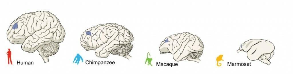 從靈長類到人類,前額葉皮層的體積顯著增加。人類前額葉皮層相對於大腦總體積的比例遠大於其他物種。同時,前額葉皮層是大腦的“中樞”,負責記憶、判斷、決策等高級認知活動。