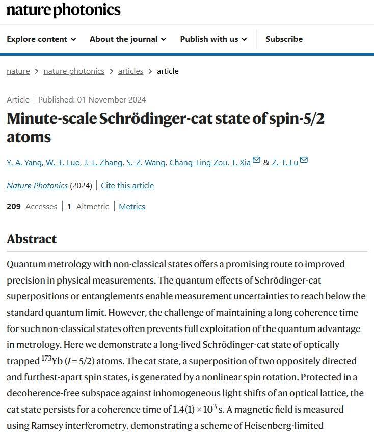 Yang, Y.A., Luo, WT., Zhang, JL. et al. Minute-scale Schrödinger-cat state of spin-5/2 atoms. Nat. Photon. (2024). https://doi.org/10.1038/s41566-024-01555-3