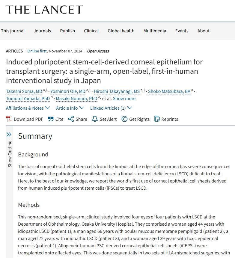Soma T, Oie Y, Takayanagi H, et al. Induced pluripotent stem-cell-derived corneal epithelium for transplant surgery: a single-arm, open-label, first-in-human interventional study in Japan. *The Lancet*, 2024. DOI: https://doi.org/10.1016/S0140-6736(24)01764-1