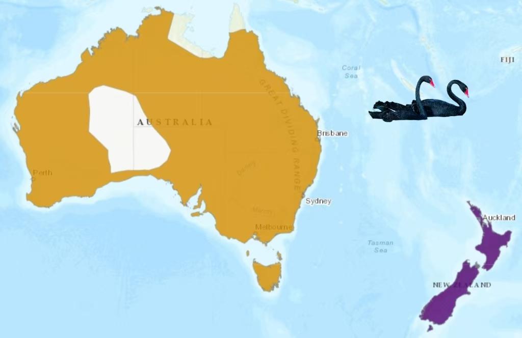 黑天鵝在澳大利亞和新西蘭的分佈,橙色代表本土物種,紫色代表外來引入(圖片來源:IUCN)