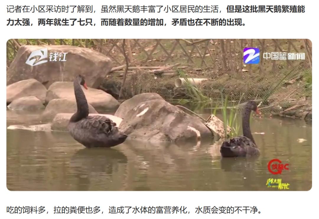 當然,外來物種並非全都是入侵物種。使得外來物種成爲入侵物種的關鍵因素通常包括其高繁殖力、廣環境適應性以及缺乏天敵等,而引入國內的黑天鵝正具備這些特點。目前黑天鵝對本土生態系統的直接影響尚未顯著,但其迅速增加的數量和廣泛的分佈預示着潛在的環境威脅。在已有的新聞報道中,黑天鵝對人類生活的一些不良影響已經開始顯現。