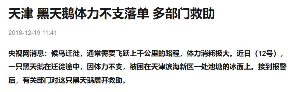 2018年央視網報道天津救助一隻黑天鵝,提及“遷徙途中”