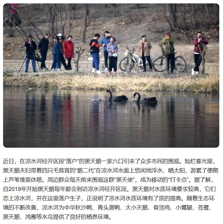 2024年北京日報報道黑天鵝一家成爲涼水河上的移動“打卡點”