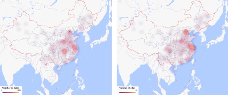 自由生活的黑天鵝在中國大陸的數量和分佈熱圖 (圖片來源:參考資料[1])