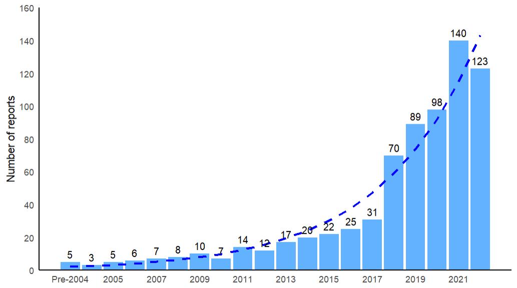 不同年份黑天鵝引進和擴散的報道數量,虛線表示指數迴歸(圖片來源:參考資料[1])