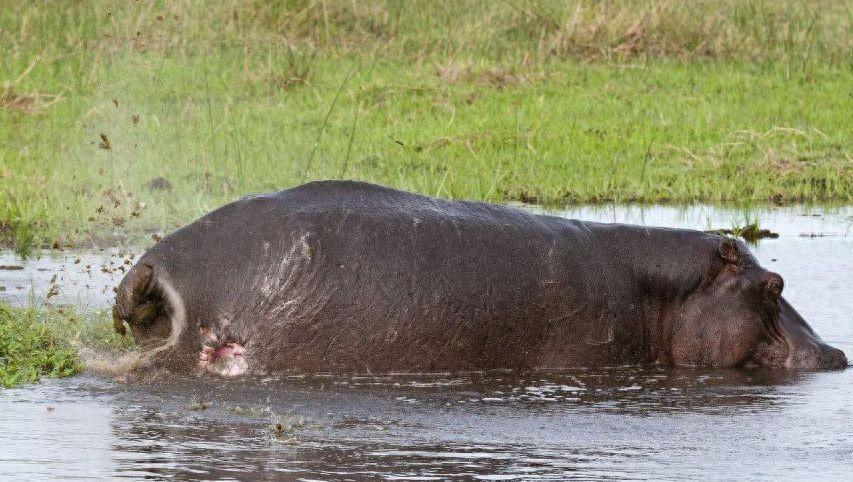 而河馬羣們霸佔着水坑,喝、拉、撒都在水裏,並且一排便就用尾巴在貼着屁股瘋狂擺動,瘋狂“掃射”的糞便在水塘子裏,就跟“天女散花”似的。