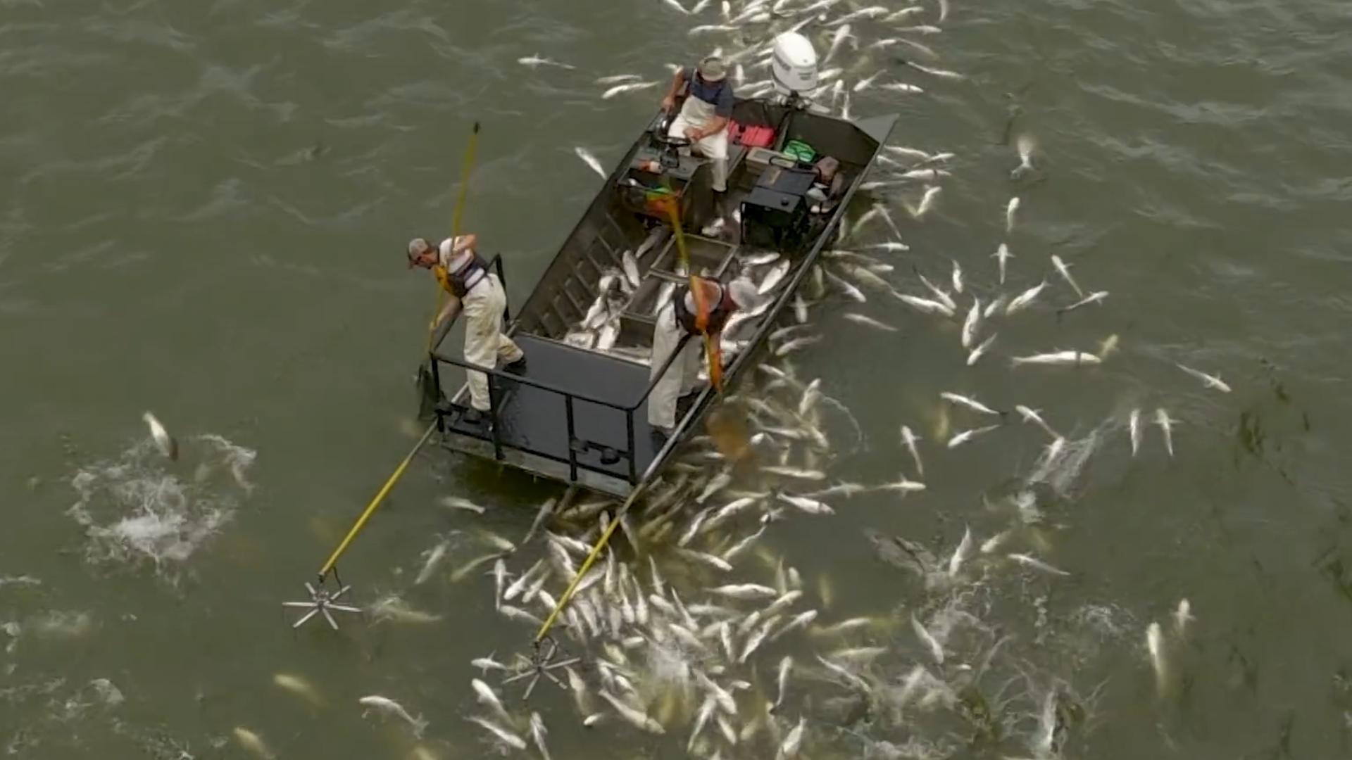 見鯉魚們集體翻白肚,剩下的零星幾條在苟延殘喘!重點美國政府對亞洲鯉魚抄家滅族,亞洲鯉魚險些掏空美國金庫!2012年,奧巴馬政府斥資5150萬美元防止亞洲鯉魚進一步入侵