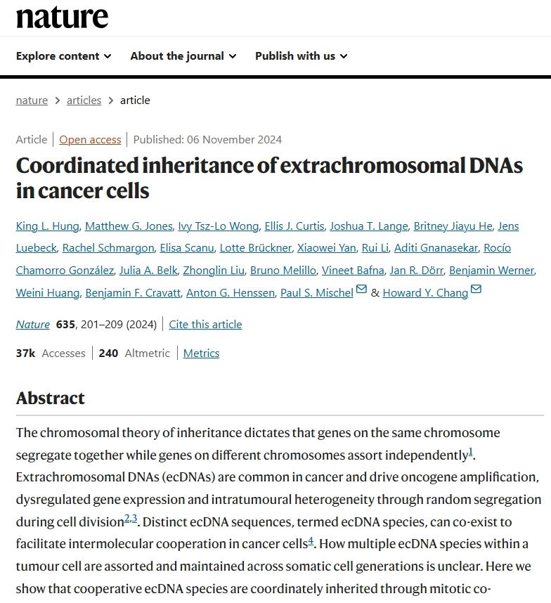 Hung, K. L., Jones, M. G., Wong, I. T., et al. (2024). Coordinated inheritance of extrachromosomal DNAs in cancer cells. Nature. DOI: 10.1038/s41586-024-07861-8