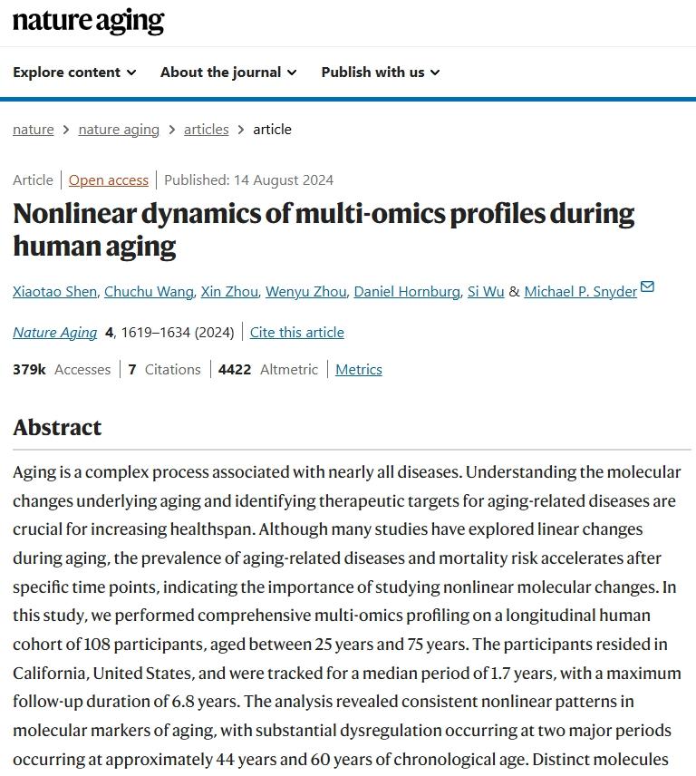Shen, X., Wang, C., Zhou, X. et al. Nonlinear dynamics of multi-omics profiles during human aging. Nature Aging, 2024, https://doi.org/10.1038/s43587-024-00692-2