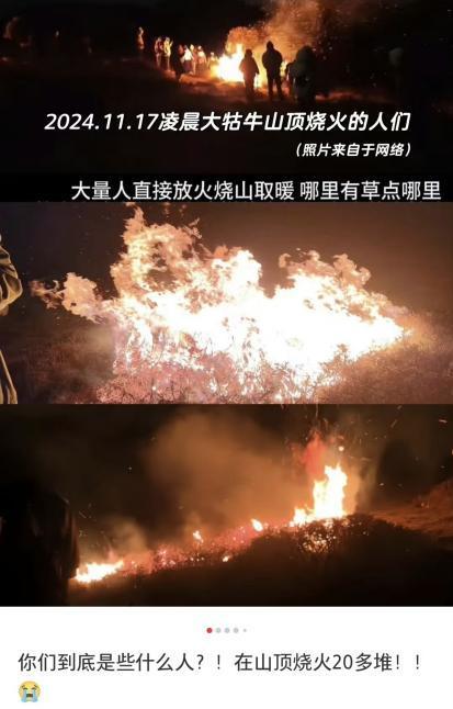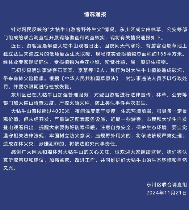 近日,有網友拍攝到,有遊客在“網紅打卡景點”雲南東川大牯牛山上砍伐樹枝燒火,燃起多個火堆。不少目擊者發文稱,這些點燃的“灌木”極有可能是曾經“紅遍嶺上”的高山杜鵑。對此,當地成立調查組進行調查,最新通報指出,“現場覈實受損植物總面積約165平方米。經林業專家現場確認,受損植物爲金花小檗、粉紫杜鵑,屬一般野生植物。”