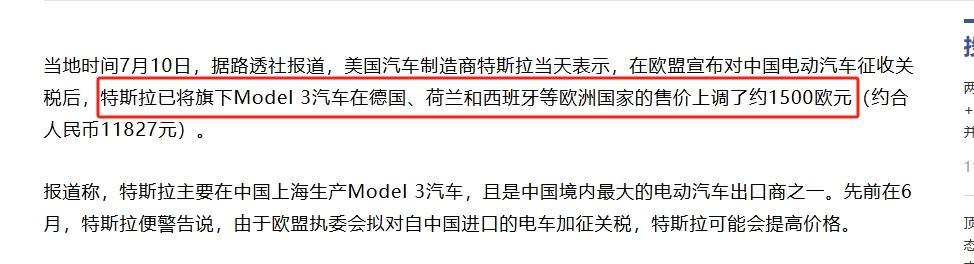 而歐盟的老百姓呢,並不會從對中國電動汽車加徵關稅中獲益,你看啊,中國出口到歐盟的電動汽車關稅從10%,提升到45.3%之後,不僅中國的電動汽車漲價了,國外車企也趁機漲價,特斯拉就宣佈上調售價,這又會加劇歐盟的通脹,可以說是沒有一點兒好處。