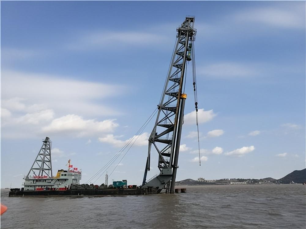 打樁船將鋼管樁緩緩沉入海中 圖片來源:(中國科學院寧波材料技術與工程研究所)