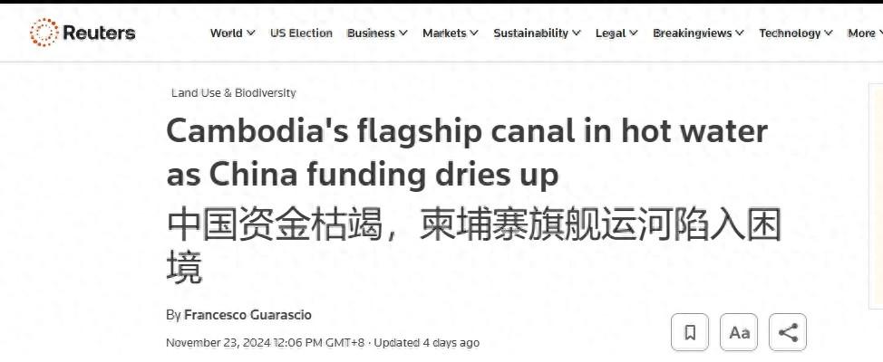 路透社報道稱,柬埔寨運河預計17億美元,其中中國將爲其提供49%的優惠貸款,其餘由柬埔寨承擔。接着造謠說,由於中國提供的資金沒有到位,柬埔寨運河陷入困境。