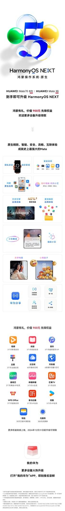 除了過硬的創新技術,華爲在寵粉方面也很有實力。在Mate品牌盛典上,華爲宣佈,參與原生鴻蒙升級的用戶,可以領取總價值900元的“鴻蒙有禮”HarmonyOS NEXT先鋒權益!不光有華爲視頻、閱讀、音樂等一大波平臺會員,還有一堆活動權益和元服務優惠券,還沒升級原生鴻蒙的小夥伴可千萬不能錯過!