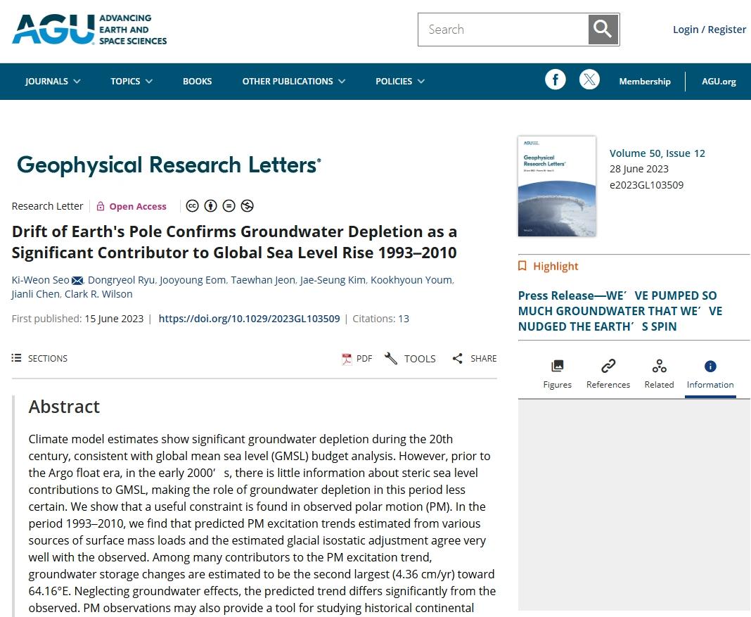 Seo, K.-W., Ryu, D., Eom, J., Jeon, T., Kim, J.-S., Youm, K., et al. (2023). Drift of Earth''s pole confirms groundwater depletion as a significant contributor to global sea level rise 1993–2010. Geophysical Research Letters, 50, e2023GL103509. https://doi.org/10.1029/2023GL103509