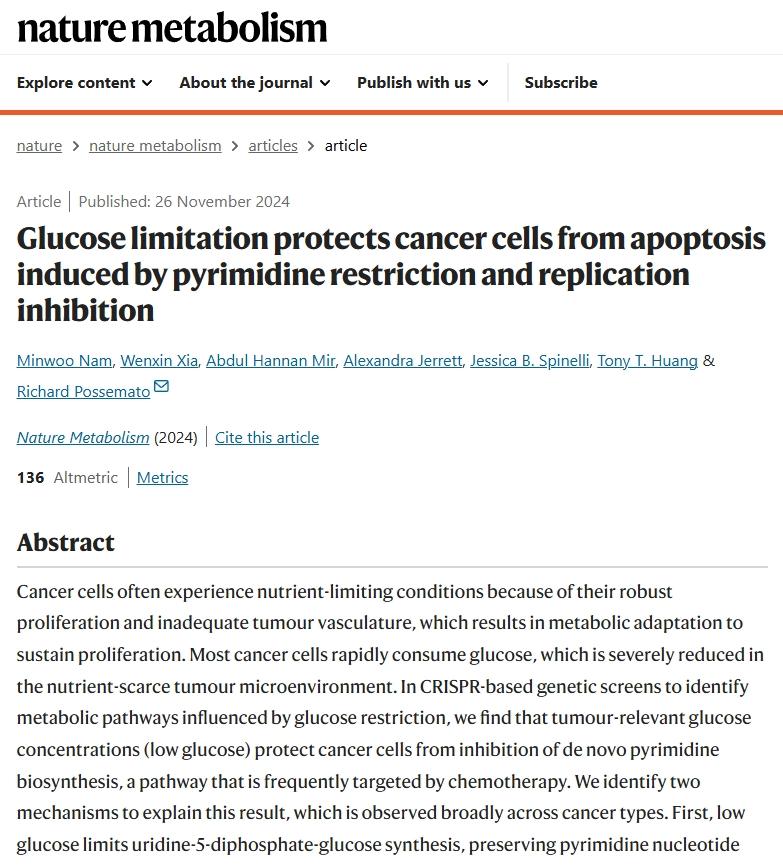 Nam, M., Xia, W., Mir, A. H., Jerrett, A., Spinelli, J. B., Huang, T. T., & Possemato, R. (2024). Glucose limitation protects cancer cells from apoptosis induced by pyrimidine restriction and replication inhibition. Nature Metabolism, 26 November 2024.