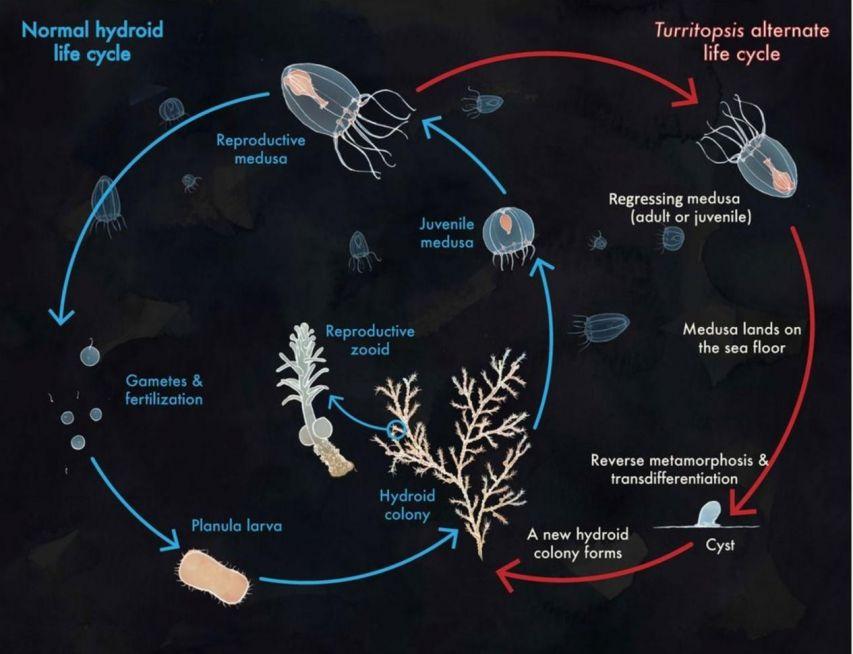 燈塔水母有兩種形態,分別是水螅體和水母體。