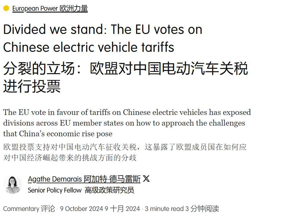 前兩點危害吧,也不是我說的,是不少歐洲智庫都在說。比如:歐洲對外關係理事會,是一家知名的歐洲智庫,他們發了一份報告《立場分歧:歐盟對中國電動汽車關稅投票》。