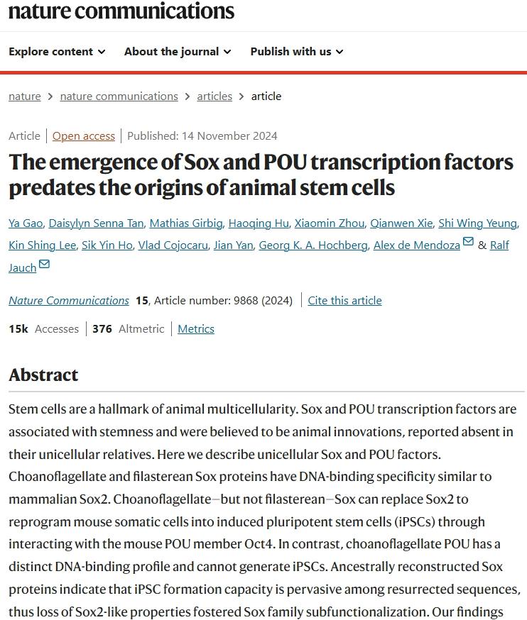 Gao, Y., Tan, D.S., Girbig, M. et al. The emergence of Sox and POU transcription factors predates the origins of animal stem cells. Nat Commun 15, 9868 (2024). https://doi.org/10.1038/s41467-024-54152-x