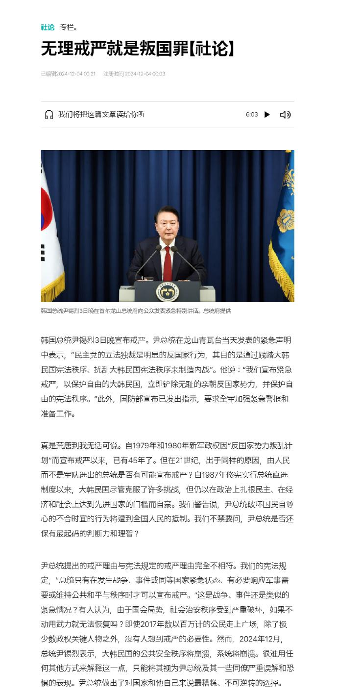 韓民族日報更是批評稱:“無理戒嚴就是叛國罪!”