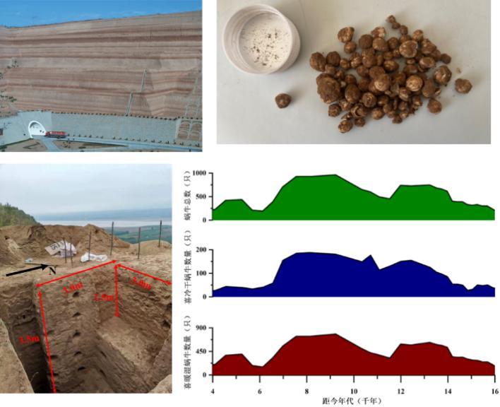左上圖爲中國黃土高原的黃土-古土壤沉積序列照片,其中黃土呈沉積灰黃色,古土壤沉積呈紅褐色,二者互層。右上圖是從黃土-古土壤沉積序列中採集到的化石蝸牛樣本。左下圖爲採集化石蝸牛時所挖的黃土探坑,我們將每10cm厚的黃土進行一次過篩,篩選出其中的化石蝸牛。右下圖爲左圖探坑中所採集化石蝸牛數量統計結果。