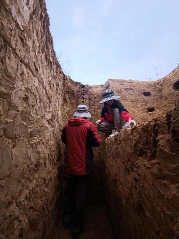 爲了採集化石蝸牛,我們需要挖掘探坑,每次將10cm深的黃土挖出,然後人工過篩,篩出蝸牛殼。有一次採樣時是初春,風特別大,周圍又全是剛過篩的鬆散黃土,一陣微風一吹,就會把黃土捲起來,瞬間給我們來一場局部的小型“沙塵暴”。所以,每天工作結束後,大家就像剛從土裏刨出來的兵馬俑,渾身上下都成了“土”色。