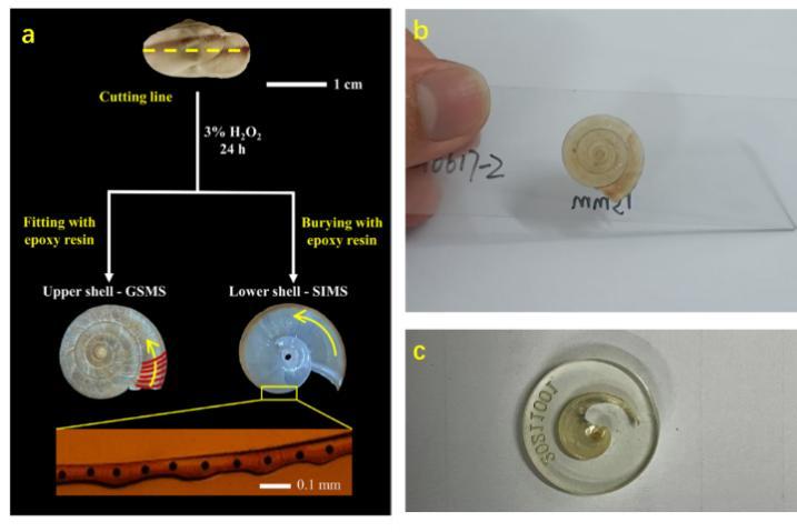 對應蝸牛的生長速率,這種手動取樣的方法大致可以達到半周的時間分辨率;殼底部分會被鑲嵌至環氧樹脂靶內,用於二次離子質譜(SIMS)的分析,其中30-100μm就可以獲得一個數據點,取樣分辨率可以達到天甚至小時級別。