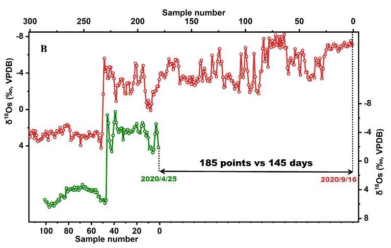 圖中紅色和綠色點線分別代表採自2020年9月16日和4月25日的兩隻蝸牛殼體的超高分辨率氧同位素(δ18Os)記錄。4月25日之前的兩個蝸牛殼體δ18Os序列較爲一致,表明不同殼體之間δ18Os具有較好的可重複性;4月25日至9月16日共145天時間,獲得δ18Os數據185個,數據的平均分辨率達到0.78天。(圖片來源:Dong et al., 2022)