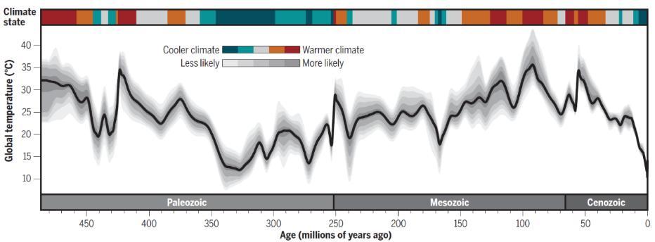 過去4.85億年間的全球平均表面溫度變化如圖所示。灰色陰影對應不同的置信水平,黑線顯示均值。頂部的彩色帶反映了氣候狀態,較冷的顏色表示“冰室”氣候,較暖的顏色表示“溫室”氣候,灰色表示過渡狀態。發現地球目前的平均表面溫度大約爲15℃,這要比顯生宙的大部分時間都要低(5億多年以來)。我們的星球也曾經有過比現在平均高20℃的時期,但是那時地球上還沒有人(或者沒有這麼多人),這也是我們現在要關注全球變暖的重要原因。