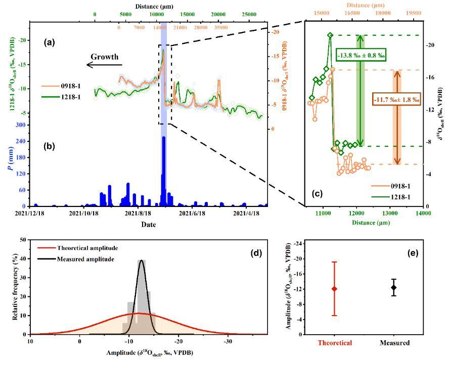 日分辨率蝸牛殼體氧同位素定量重建“7.20”特大暴雨。(a)SIMS測定的兩隻現代蝸牛(樣本0918-1和1218-1)的日分辨率殼體氧同位素記錄。黑色箭頭代表殼體生長方向。(b)鄭州逐日降水記錄(數據來源:http://data.cma.cn/)。藍色陰影表示“7.20”特大暴雨造成了蝸牛殼體氧同位素發生劇烈負躍變(c)爲(a)圖中虛線矩形部分的放大圖,爲“7.20”特大暴雨導致的兩個現代蝸牛樣本實測δ18Oshell 振幅的對比。(d)“7.20”特大暴雨造成的蝸牛殼體氧同位素振幅的理論值(紅色)和實測值(黑色)的概率密度分佈。(e)“7.20”暴雨引起蝸牛殼體氧同位素理論值(紅色)和實測值(黑色)的平均值及90%置信區間。(圖片來源:Wang et al., 2024)