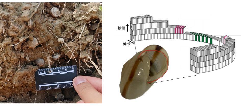 條華蝸牛野外照片(左)和蝸牛殼的生長模式(右) (修改自Füllenbach et al., 2014)