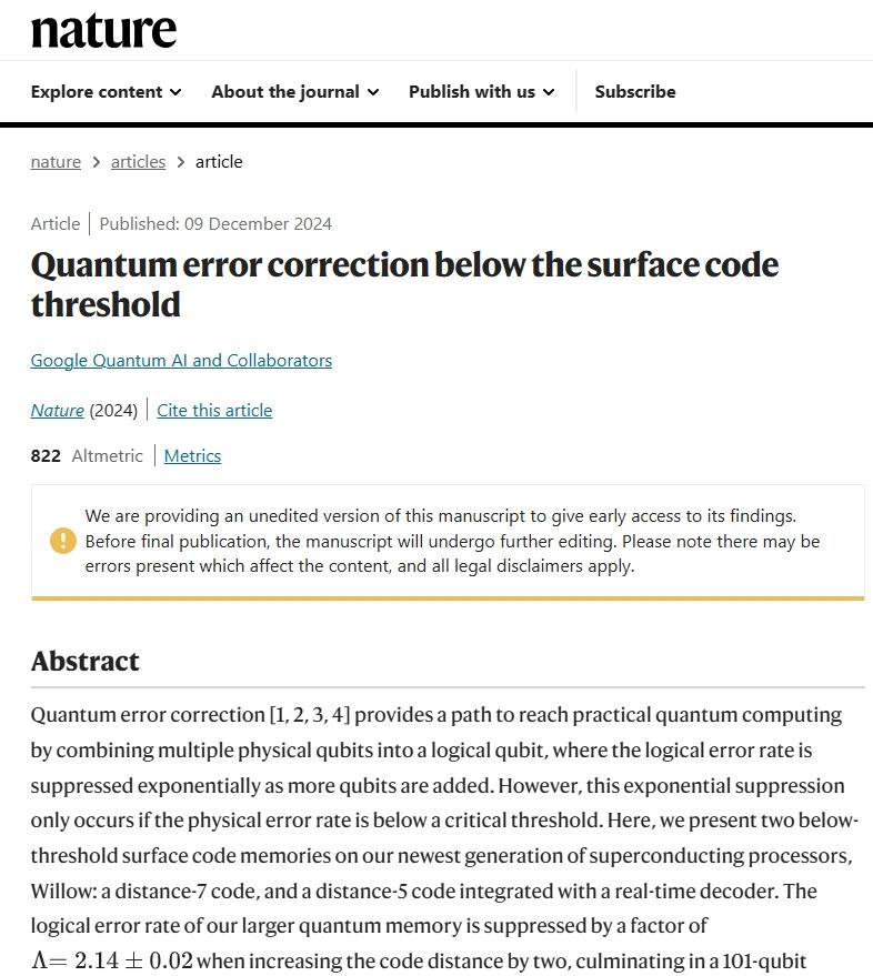 更重要的是,谷歌的“Willow”芯片是首個實現“下限閾值(below threshold)”的量子計算原型——也就是,在增加量子比特的同時,錯誤反而減少的奇蹟。這一成就代表着量子計算正式跨入實用化的前沿。
