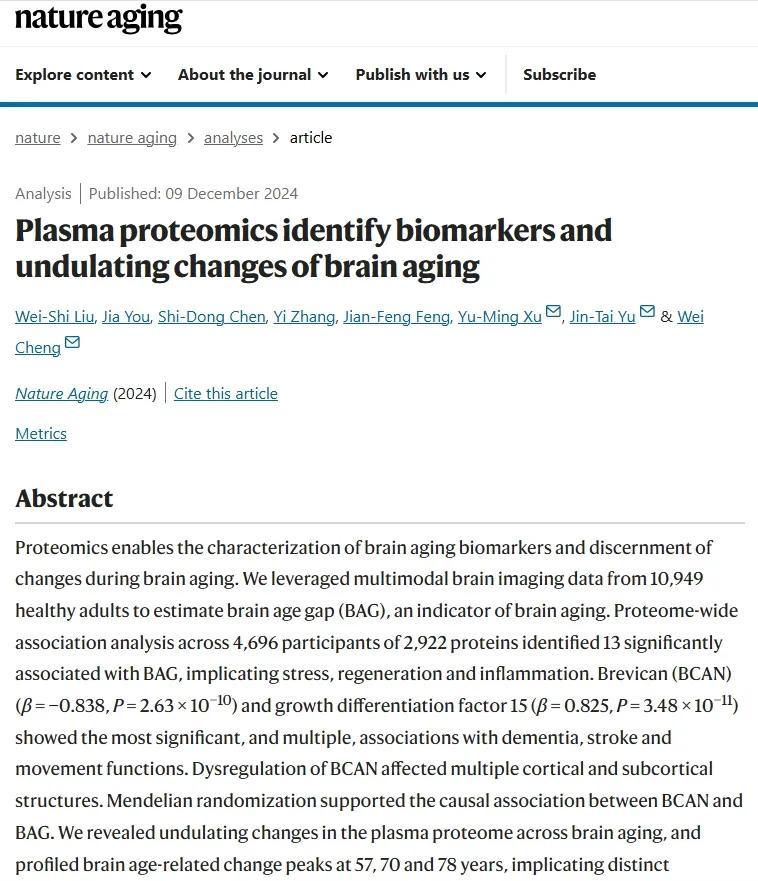 - Liu, WS., You, J., Chen, SD. et al. Plasma proteomics identify biomarkers and undulating changes of brain aging. Nat Aging (2024). https://doi.org/10.1038/s43587-024-00753-6