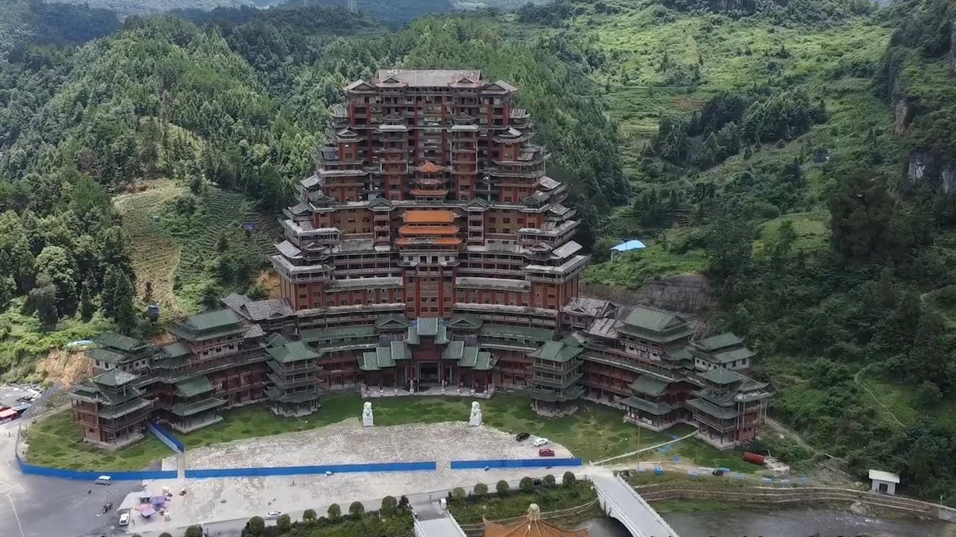 原來和圍環境融合完美,現在就像縣城裏冒出個獨棟大別墅,豎在山上格格不入,早先它集合了水族、布依族等少數民族元素,2016年剛開工就半場開香檳:申報了三項吉尼斯世界紀錄”最高琉璃陶建築;世界最高水族、布依族、苗族民族元素建築;世界最大牌樓。全木質框架榫sun卯mao 結構!設計圖來自“湘西鬼才”李宏進的靈感!遺憾的是2020年項目被緊急叫停!爛尾三年之久!得益現在互聯網的傳播,誇獎的一句沒有!