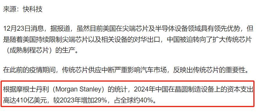 更關鍵的是,根據摩根士丹利的統計,2024年中國在晶圓製造設備上的資本支出高達410億美元,較2023年增加29%,佔全球約40%。也就是說,咱們還在持續蓄力中,這還遠遠不到我們的真實實力。