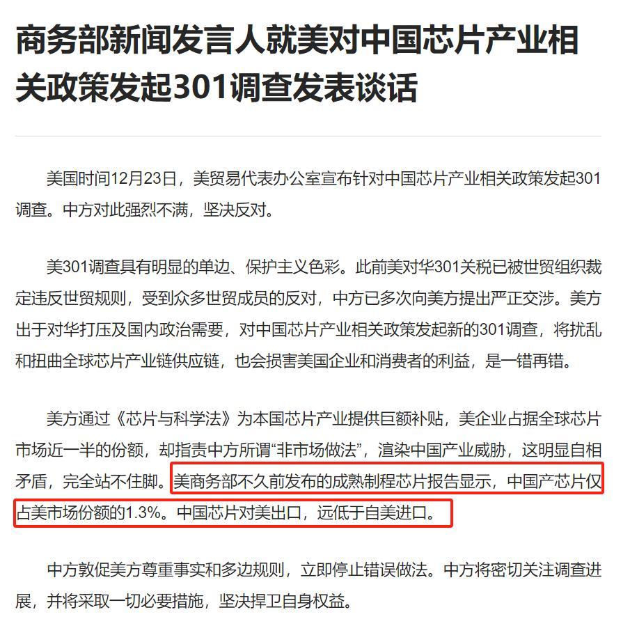 就像電動車那樣,其實美國原本就不允許它們國內企業,進口我們的電動車,一直以來,他們也不讓他們國內企業,進口我們的成熟製程芯片,中國產芯片僅佔美市場份額的1.3%。影響不大。所以,301調查能達到的效果就是,又一款美國嚴選誕生了。
