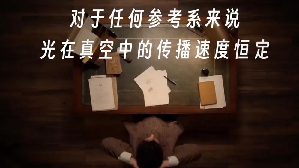 想到這裏,愛因斯坦手上紙菸的菸灰掉落在地上,瞬間碎成一片。愛因斯坦從沉思中回過神來,對剛纔的思考感到滿意,他想這個問題已經不止一天兩天了。他拿起筆在草稿紙上寫下一句話:對於任何參考系來說,光在真空中的傳播速度恆定。