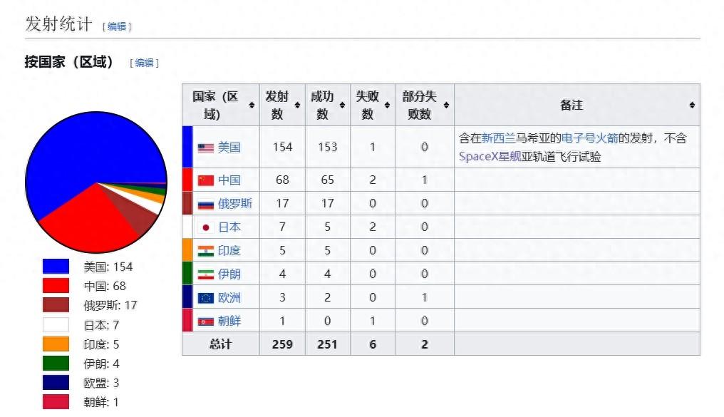 2024年全球一共發射了259次,其中美國第一154次,成功153次,失敗1次;中國68次,成功65次,失敗2次,部分失敗1次;俄羅斯17次,全部成功,日本7次,成功5次;印度5次,全部成功;伊朗4次,全部成功,歐洲3次,成功2次,部分失敗1次,朝鮮1次,失敗了。