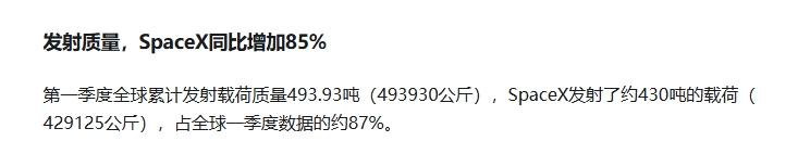 我沒有找到2024年全球航天發射載荷質量的數據,但是2024年第一季度,全球發射載荷質量是493.93 噸,其中SpaceX發射了430 噸的載荷,佔全球約 87%。