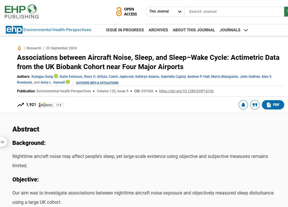 Gong, X., Eminson, K., Atilola, G. O., et al. Associations between aircraft noise, sleep, and sleep–wake cycle: Actimetric data from the UK Biobank cohort near four major airports. Environmental Health Perspectives, 132(9), 097006. https://doi.org/10.1289/EHP14156