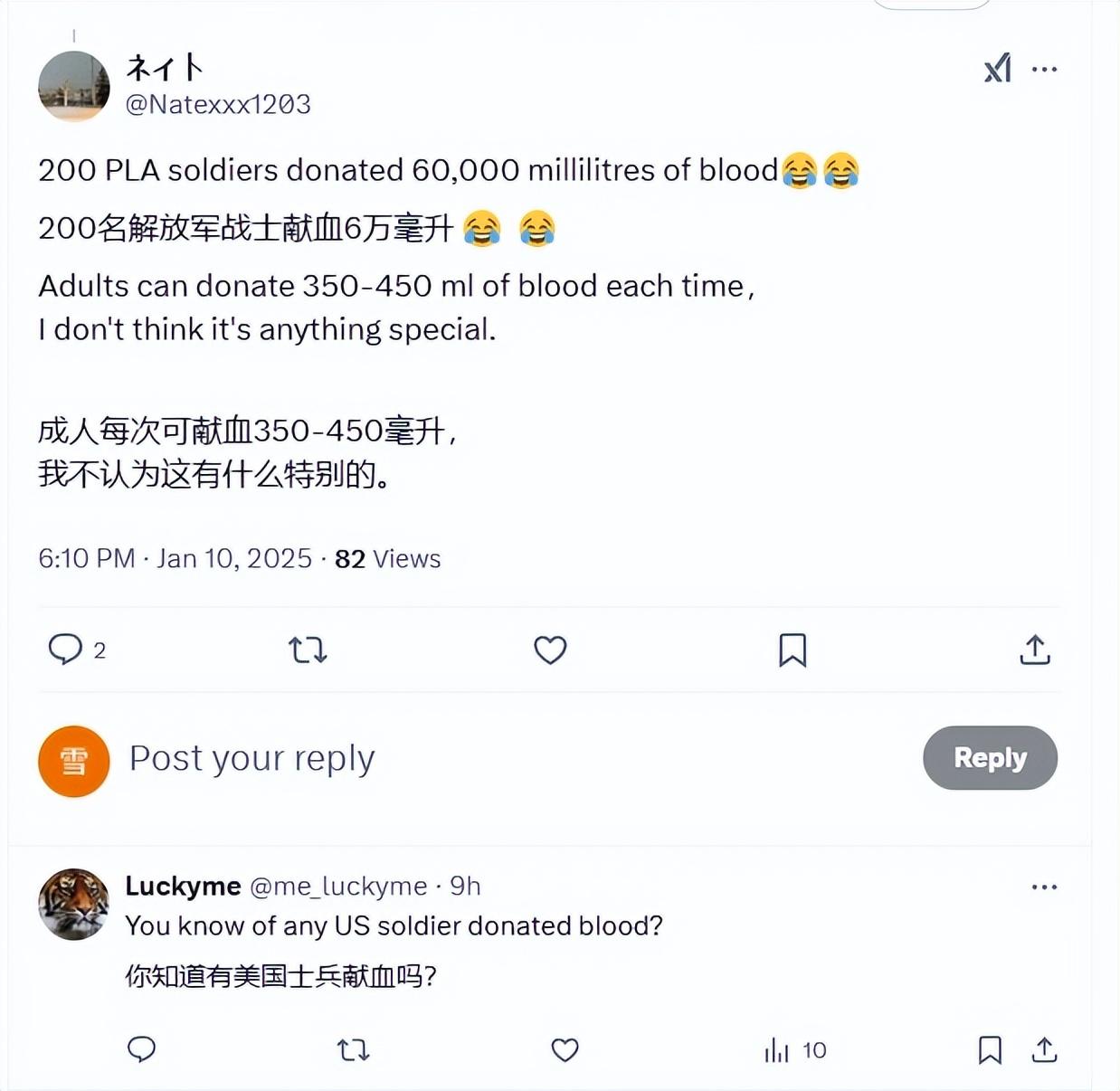 還有一個人說,200名解放軍戰士獻了60000毫升的血,我認爲並沒有什麼特別的。不過還沒等中國人懟他,就有一名外國人回覆說,你知道有美國士兵獻血嗎?